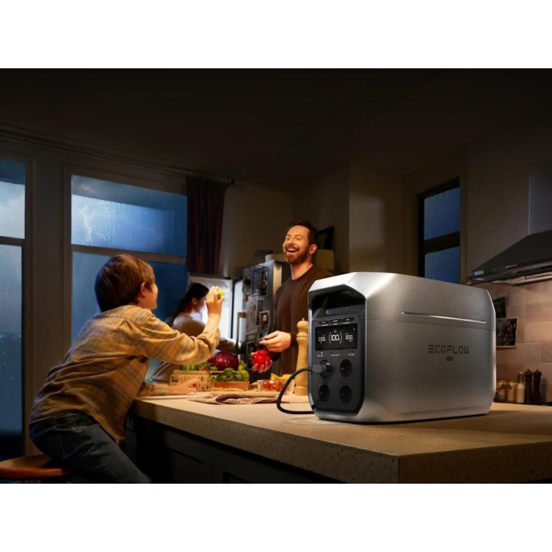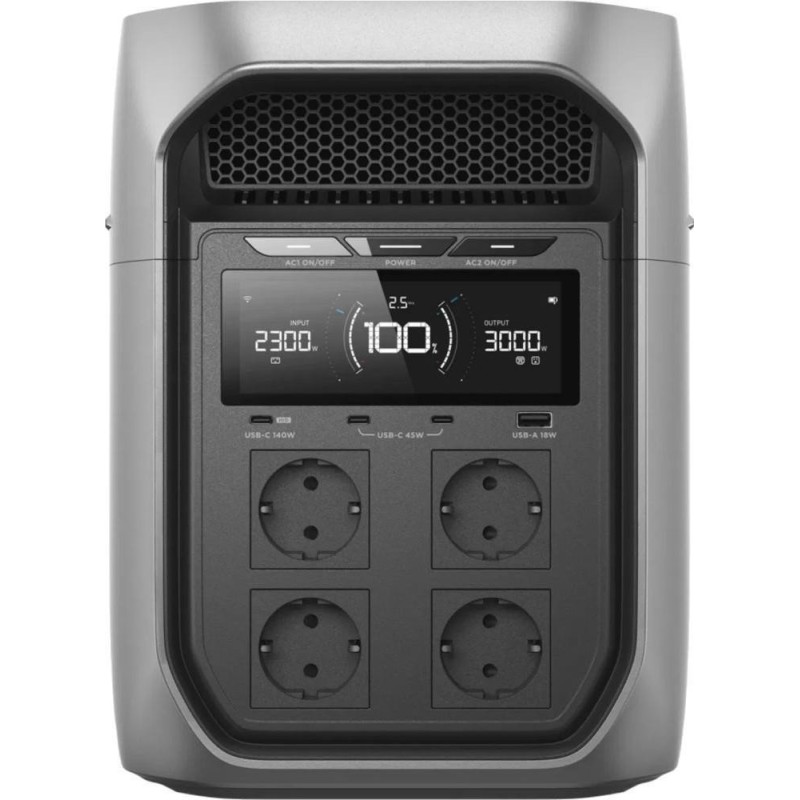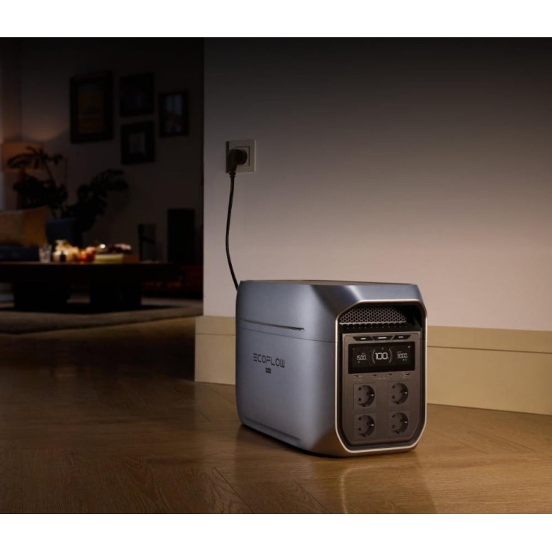 Портативна електростанція EcoFlow DELTA 3 Max Plus (модель EF-DL3-MP, EFD3MP-EU-CBOX) оснащена акумулятором ємністю 2048 Вт-год (LiFePO₄) і забезпечує безперервну потужність до 3000 Вт із піковим значенням до 6000 Вт. Габарити становлять 494 × 242 × 305 мм, вага близько 22,1 кг. Зарядка від мережі можлива потужністю до 1800 Вт, що дає змогу відновити заряд з 0 до 80 відсотків приблизно за 64 хвилини. Підтримується сонячна зарядка потужністю до 1000 Вт через роз'єм XT60, що забезпечує можливість використання в автономних умовах. EcoFlow DELTA 3 Max Plus оснащена функцією UPS із часом перемикання менше ніж 10 мс, що гарантує безперервну роботу під'єднаних приладів у разі вимкнення мережі. На передній панелі розташовані чотири розетки змінного струму, порти USB-C (один до 140 Вт і два по 45 Вт) і порти USB-A (до 18 Вт). Ці інтерфейси дають змогу одночасно живити ноутбуки, монітори, смартфони та інші пристрої. Акумуляторна система на базі LiFePO₄ забезпечує підвищену надійність, стійкість до перегріву та ресурс понад 3000 циклів зарядки-розрядки до 80 відсотків ємності. EcoFlow DELTA 3 Max Plus підтримує розширення ємності до 10 кВт-год за рахунок додаткових модулів акумуляторів, що робить її гнучким рішенням для довготривалого резервного живлення вдома або для польових умов. Керування та моніторинг параметрів роботи можливі через застосунок EcoFlow по Wi-Fi або Bluetooth із доступом до даних про заряд, режими роботи та пріоритети навантаження. Модель DELTA 3 Max Plus характеризується низьким рівнем шуму в режимі заряджання й оптимізованою системою охолодження з інтелектуальним керуванням вентиляторами. EcoFlow DELTA 3 Max Plus підходить для використання в кемпінгу, в поїздках, на будівельних майданчиках і в якості резервного джерела живлення для будинку або офісу.