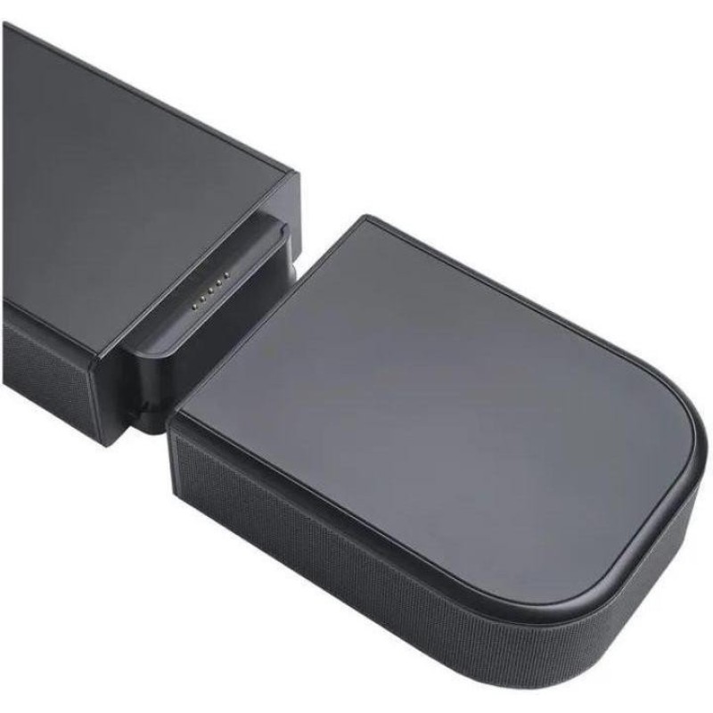 JBL Bar 800MK2 (JBLBAR800M2BLK) — це 7.1-канальна саундбар-система для телевізора з підтримкою просторового звуку Dolby Atmos, DTS Virtual:X і фірмової технології MultiBeam 3.0, яка формує ширшу звукову сцену без потреби в стаціонарних тилових колонках. Система складається з основної панелі, двох знімних бездротових тилових модулів і бездротового сабвуфера 10", тому JBL Bar 800MK2 (JBLBAR800M2BLK) підходить для кімнат, де важливо отримати об’ємне звучання без складного кабельного монтажу. Максимальна вихідна потужність становить 780 Вт, при цьому сама панель видає до 400 Вт, тилові модулі — по 40 Вт кожен, а сабвуфер — до 300 Вт; частотний діапазон заявлений на рівні 35 Гц – 20 кГц, що дає змогу покрити як діалоговий діапазон, так і низькі частоти у фільмах та іграх. Для підключення передбачено HDMI eARC, один HDMI-вхід, оптичний вхід, Bluetooth 5.3 та Wi-Fi з підтримкою стандартів 2.4 і 5 ГГц, а відеосигнал може проходити з HDR10+ і Dolby Vision, тому систему зручно інтегрувати в сучасну ТВ-конфігурацію з консоллю або медіаплеєром. Окремо варто відзначити PureVoice 2.0 для покращення розбірливості діалогів, SmartDetails для детальнішої передачі дрібних звуків, режим нічного прослуховування та просте калібрування під кімнату. Знімні тилові модулі працюють від вбудованої батареї до 10 годин, а загальна ширина системи з підключеними модулями становить 1163 мм, тому JBL Bar 800MK2 (JBLBAR800M2BLK) можна розглядати як повноцінне рішення для домашнього кінотеатру без окремого AV-ресивера.