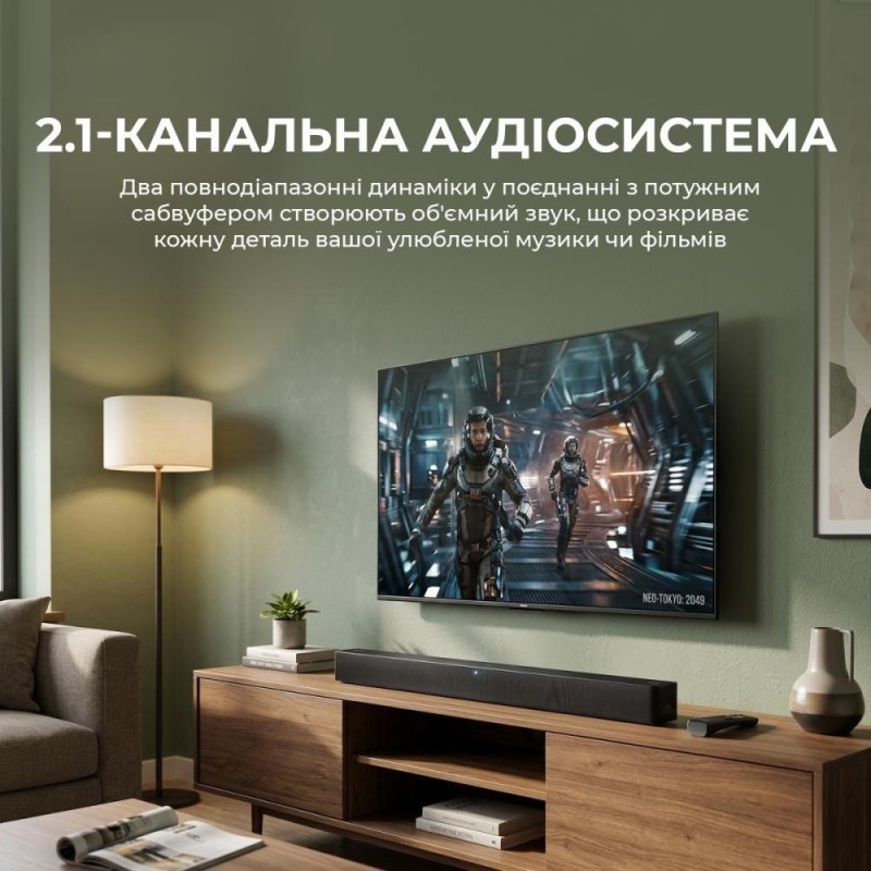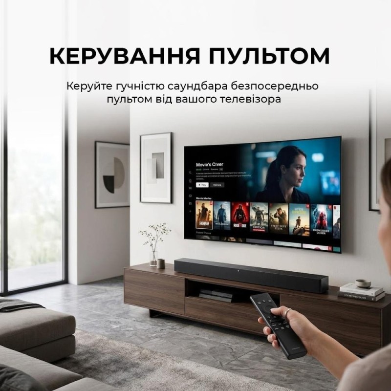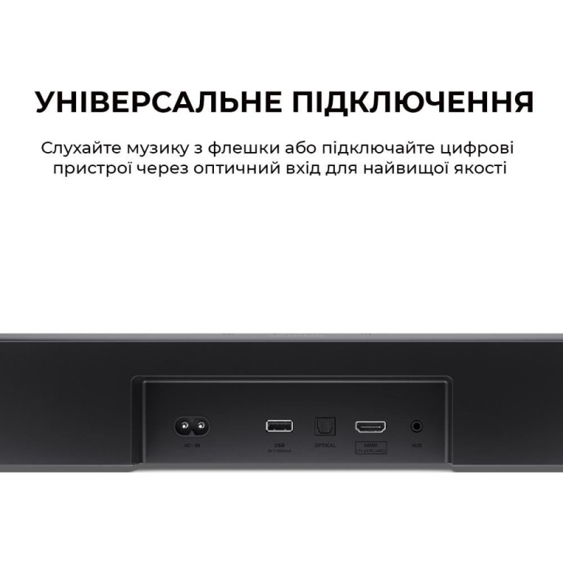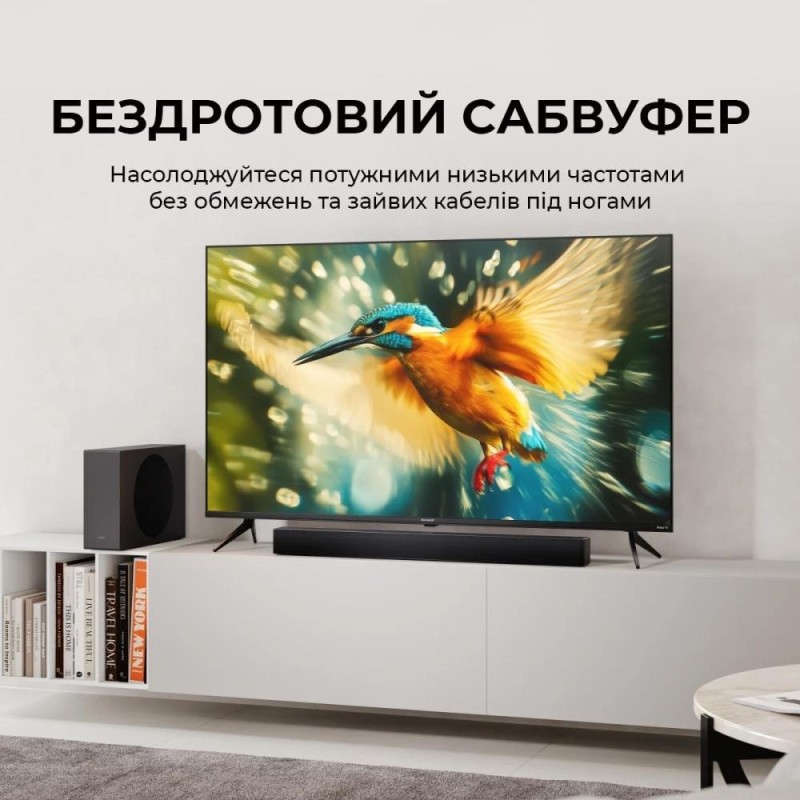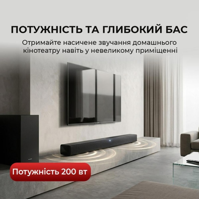 Саундбар, Бездротовий сабвуфер, Пульт дистанційного керування (з батарейками), Кабелі живлення, Кріплення для настінного кріплення (для саундбару), Гумові прокладки (для сабвуфера), Документація користувача