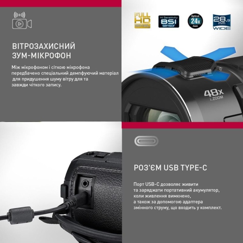 AVCHD: 1080 / 50p (28 Мбіт / с / VBR; 1920x1080 / 50p), PH (24 Мбіт / с / VBR; 1920x1080 / 50i), HA (17 Мбіт / с / VBR; 1920x1080 / 50i), HG (13 Мбіт / с / VBR; 1920x1080 / 50i), HE (5 Мбіт / с / VBR; 1920x1080 / 50i); MP4: (2160p / 25p (72M) (72 Мбіт / с / VBR), (3840x2160); 2160p / 24p (72M) (72 Мбіт / с / VBR), (3840x2160); 1080p / 50p (50M) (50 Мбіт / с / VBR), (1920x1080); 1080p / 50p (28M) (28 Мбіт / с / VBR), (1920x1080); 1080p / 24p (50M) (50 Мбіт / с / VBR), (1920x1080); 720p / 25p (9M) (9 Мбіт / с / VBR), (1280x720)