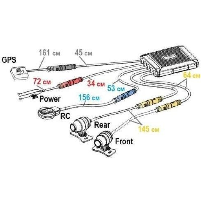 Основний блок керування, передня камера, задня камера, пульт керування, GPS Модуль, металеве кріплення, пластикове кріплення, силовий кабель, картридер, карта пам'яті Micro SD (32gb), комплект 3М стікерів, набір липучок
