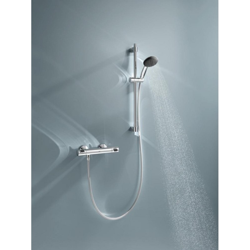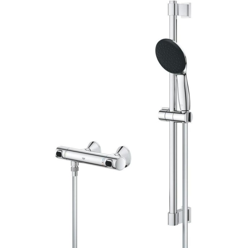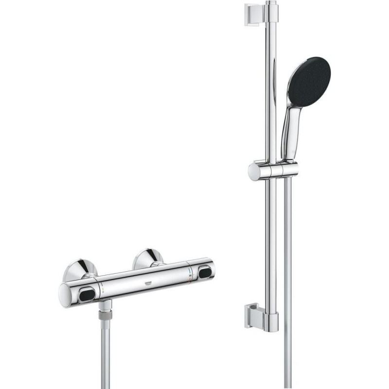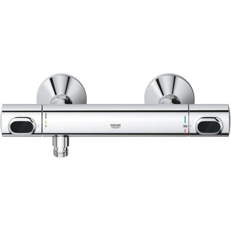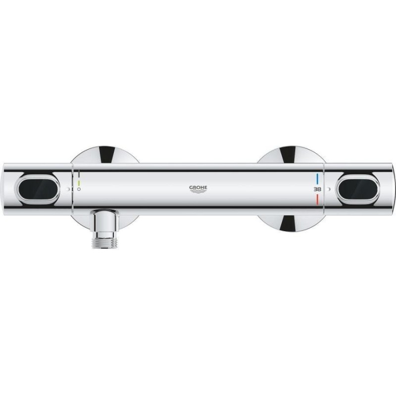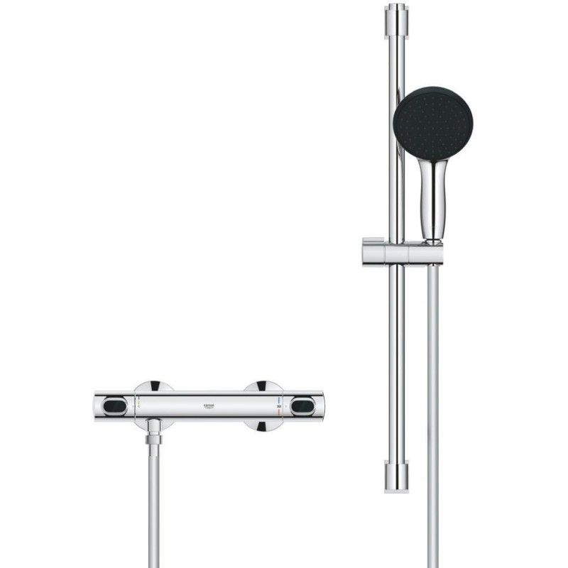 GROHE термостатичний картридж з восковим термоелементом, рукоятка регулювання водного потоку з кнопкою GROHE EcoButton (економічна кнопка з індивідуальними налаштуваннями стопора), вентильна головка 90°, відведення душу знизу 1/2", вбудовані зворотні клапани, фільтри для затримання з проточним водонагрівачем, штанга підходить для прикручування (включає шурупи та дюбеля) або приклеювання (клей GROHE QuickGlue S 41247000 продається окремо – потрібно 2 шт.), максимальне навантаження: 20 кг (вказана маса дійсна) навантаження та використання за призначенням).