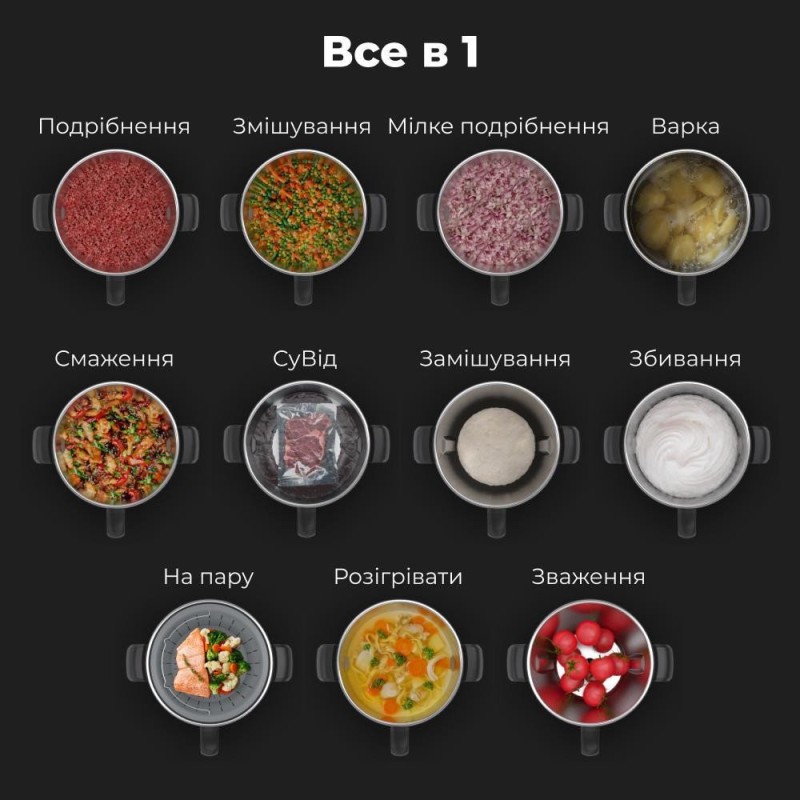 насадка для змішування (1), маленький кошик для пароварки (1), вставка для пароварки (1), корзина для пароварки (1)
