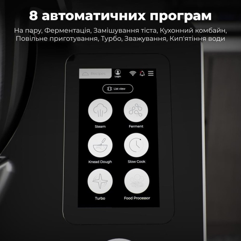 8 автоматичних програм. 180+ покрокових рецептів – Wi-Fi. Зручний 5'' сенсорний екран. Широкий діапазон температур (37-120 ° С). Вбудована точна вага на 5 кг. Таймер: 90 хвилин. Довжина кабелю живлення: 1 м. Розміри: 384 х 330 х 280 мм. Вага: 7.8 кг