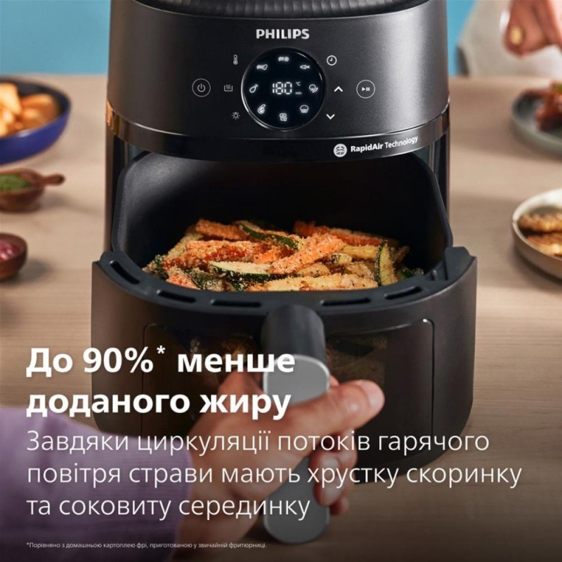 Philips Airfryer NA231\u002F00 - це мультипіч, створена для тих, хто цінує смачну та корисну їжу без зайвої олії. Завдяки технології Rapid Air гаряче повітря рівномірно циркулює всередині чаші, забезпечуючи хрустку скоринку та соковиту середину в кожної страви. Потужність 1700 Вт дає змогу швидко розігріватися та готувати з максимальною ефективністю. Містка чаша об'ємом 6,2 літра розрахована на приготування до 800 грамів картоплі фрі, 8 курячих гомілок або 800 грамів овочів - ідеальний обсяг для сім'ї або компанії друзів. Пристрій оснащений сенсорною панеллю керування з 9 автоматичними програмами, таймером на 60 хвилин і регульованим термостатом від 60 до 200 °C, що дає змогу гнучко підлаштовуватися під будь-які рецепти. Оглядове вікно дає можливість спостерігати за процесом приготування без відкриття кришки, зберігаючи тепло і стабільну температуру. Зручні функції підігріву та підтримки тепла роблять Philips Airfryer NA231\u002F00 особливо практичною в повсякденному готуванні. Додаток HomeID відкриває доступ до сотень рецептів, спеціально адаптованих під цю модель, допомагаючи щодня відкривати нові смаки.
