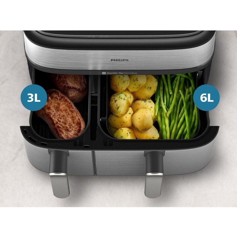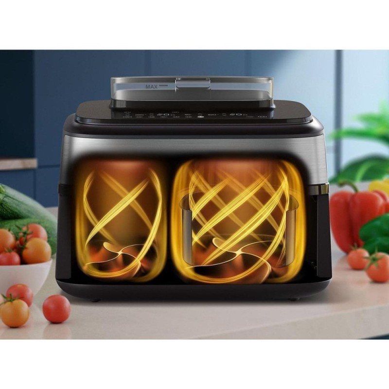 Автоматична синхронізація часу приготування у 2 кошиках, щоб страви були готові одночасно. Мультипіч ємністю 9 л з 2 кошиками та функцією приготування на пару. Додаток HomeID.