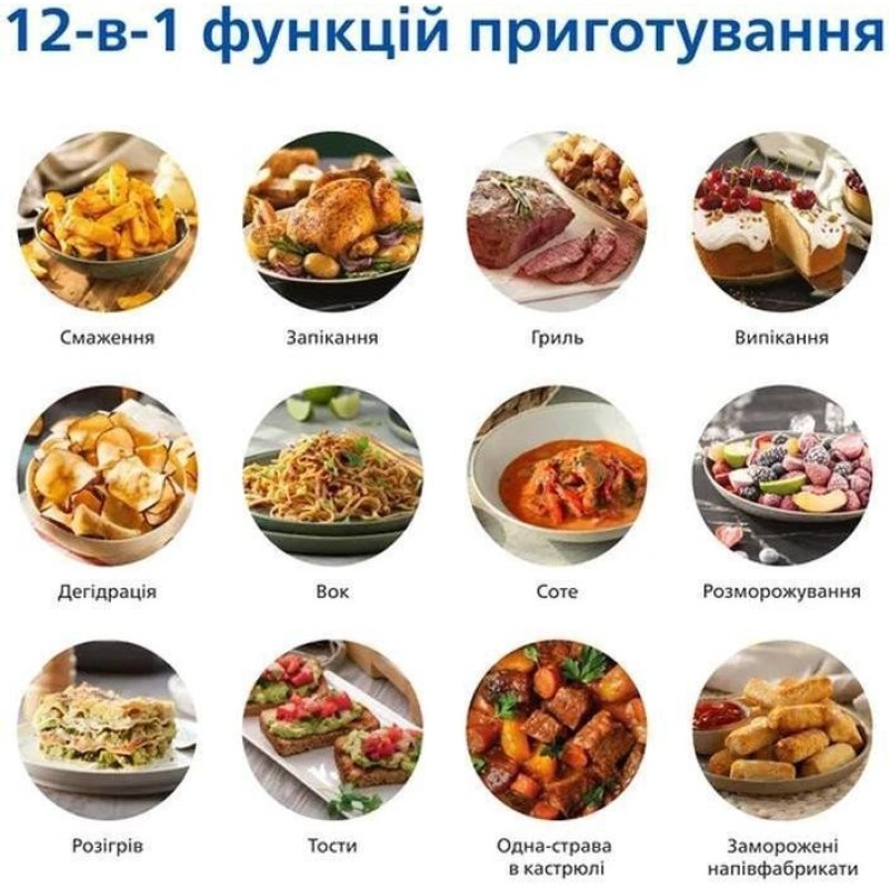 Смачна скоринка із технологією RapidAir. 12 режимів приготування в одному зручному приладі. Смачні рецепти для аерогрилю у додатку HomeID. Антипригарну ємність StarPlate та чашу можна мити в посудомийній машині.