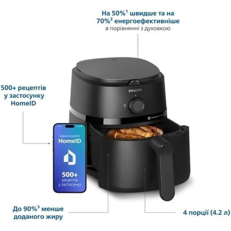 Мультипіч Philips Series 1000 NA120\u002F00 - це універсальний кухонний прилад, що поєднує в собі функції смаження, випікання, гриля та запікання, а завдяки технології RapidAir та унікальному дизайну Starfish мультипіч забезпечує рівномірний розподіл гарячого повітря, створюючи хрустку скориночку зовні та ніжну текстуру всередині продуктів.\r\nЗ потужністю 1500 Вт і місткістю 4,2 літра, цей прилад ідеально підходить для приготування до 500 грамів картоплі фрі, шести курячих ніжок або 500 грамів овочів, що робить його чудовим вибором для сімейних обідів і вечерь. Компактні розміри мультипечі Philips Series 1000 NA120\u002F00 дають змогу легко розмістити її на кухні будь-якого розміру.\r\nДля зручності користувачів мультипіч оснащена антипригарною ємністю StarPlate і листом, які можна мити в посудомийній машині, значно полегшуючи процес очищення після використання.\r\nРегульовані налаштування часу та температури забезпечують додаткову гнучкість, даючи змогу адаптувати процес приготування під конкретні страви.\r\nДодатково, Philips надає доступ до додатка HomeID, де можна знайти безліч безкоштовних рецептів, спеціально розроблених для аерогриля.\r\nВикористання мультипечі Philips Series 1000 NA120\u002F00 дає змогу готувати страви на 50% швидше й заощаджувати до 70% електроенергії порівняно з використанням духової шафи, що робить її енергоефективним рішенням для сучасної кухні.