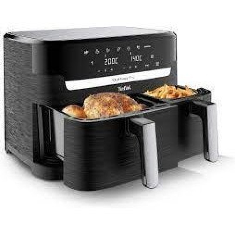 Двокамерна фритюрниця з гарячим повітрям, двома незалежними чашами, чашею розміру XXL та звичайною для одночасного приготування двох різних страв. 6 автоматичних програм (фрі, курка, овочі, риба, десерт, дегідрація) та ручний режим.