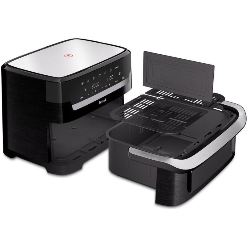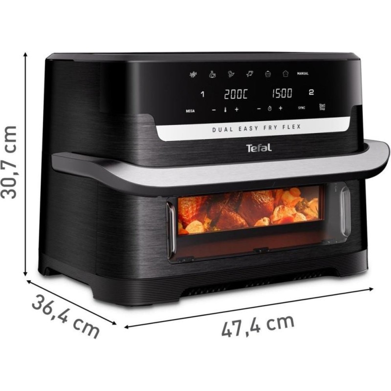 Tefal Dual Easy Fry Flex EY9228E0 - мультипіч, розрахована на приготування великих обсягів продуктів за один раз (до 8 порцій). Модель оснащена знімним роздільником FlexCook, який дає змогу перемикатися між двома незалежними зонами об'ємом 5,5 л + 3,5 л і однією великою камерою на 9 л. Конструктивна гнучкість дає змогу готувати одразу дві різні страви з різним часом і температурою, або використовувати весь об'єм для однієї великої страви - наприклад, запекти курку або два цілих курчати, або велику порцію картоплі фрі.\r\nПотужність Tefal Dual Easy Fry Flex EY9228E0 досягає 2700 Вт, що забезпечує швидке нагрівання і скорочує загальний час приготування. Завдяки високій продуктивності пристрій справляється з рівномірною термообробкою продуктів навіть при повному завантаженні обох камер.\r\nСенсорна панель управління розташована на фронтальній частині пристрою і включає інтуїтивно зрозумілий цифровий дисплей з підсвічуванням. На панелі передбачено автоматичні програми для різних продуктів, включно зі свіжою та замороженою картоплею, м'ясом птиці, рибою, овочами та десертами, а також ручний режим із можливістю точного налаштування температури та часу приготування. Завдяки технології циркуляції гарячого повітря їжа готується рівномірно, а наявність антипригарного покриття в піддоні та кошику полегшує догляд і чищення. Вбудоване оглядове вікно з підсвічуванням дає можливість візуально контролювати процес готування без необхідності відкривати кошик, що допомагає зберігати стабільну температуру всередині камери та покращує кінцевий результат. Корпус Tefal Dual Easy Fry Flex EY9228E0 виконаний з нержавіючої сталі, що підвищує його стійкість до пошкоджень і спрощує догляд за зовнішньою поверхнею.