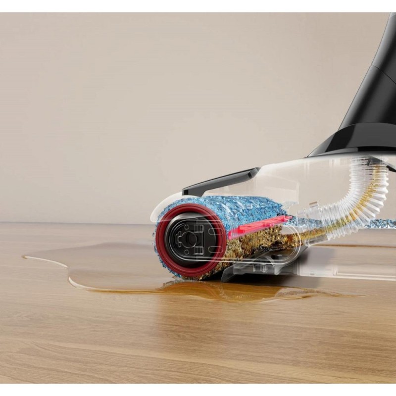 Док-станція та станція очищення. Щітка, оснащена скребком Tangle-Free, чудово підходить для видалення волосся та інших складних забруднень із підлоги. Повна свобода пересування забезпечується можливістю повороту на 90 ° - зручне маневрування на великих і малих поверхнях. Прибирання пилососом під меблями з високими ніжками без проблем - пилосос можна встановити під кутом 180° Двигун зі швидкістю обертання 104 000 об/хв забезпечує потужність всмоктування 18 000 Па. Функція самоочищення за високої температури 75°C