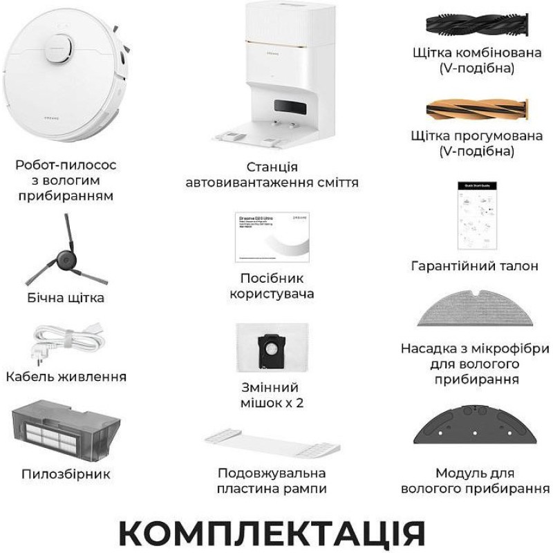 Робот-пилосос, Змінний мішок х 2, Станція автовивантаження сміття, Подовжувальна пластина рампи, Щітка комбінована (V-подібна), Щітка прогумована (V-подібна), Модуль для вологого прибирання, Насадка з мікрофібри для вологого прибирання, Пилозбірник,