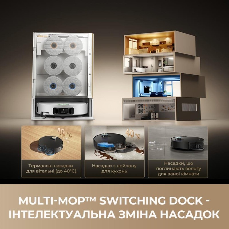 Насадки для миття підлоги х 12, Кабель живлення, HEPA-фільтр, Подовжувальна пластина рампи, Посібник користувача, Змінний мішок х 4, Гарантійний талон, Робот-пилосос миючий, Мультифункціональна станція з автовивантаженням сміття, Модуль для миття підлоги 6 (V-подібна), Пляшка з миючим засобом х 3, Засіб проти запаху домашніх тварин х 2, Щітка комбінована (V-подібна), Пилозбірник