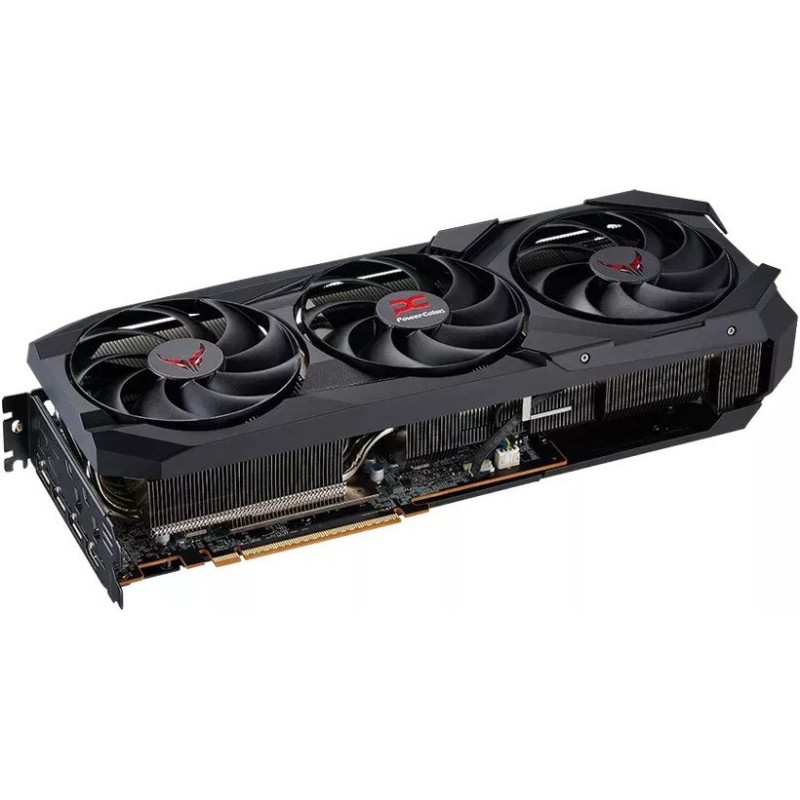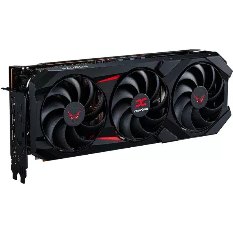PowerColor Red Devil AMD Radeon RX 9070 XT 16GB GDDR6 (RX9070XT 16G-E\u002FOC) побудована на архітектурі AMD RDNA 4 і обладнана 16 ГБ відеопам'яті типу GDDR6. Використовуваний інтерфейс підключення - PCI Express 5.0 x16. Охолодження реалізовано за рахунок трьох вентиляторів діаметром 100 мм, семи теплових трубок 6 мм і великого радіатора з вертикальним розташуванням ребер. Масивна мідна основа з нікелюванням забезпечує прямий контакт з графічним процесором і чипами пам'яті, а термоінтерфейс Honeywell PTM7950 підвищує ефективність теплопередачі. Керування вентиляторами здійснюється інтелектуальною системою з температурними датчиками, що забезпечує автоматичну зупинку вентиляторів у разі зниження температури нижче 50°C. Відеокарта оснащена потрійним підсвічуванням ARGB і має металеву посилену пластину на зворотному боці. Електроживлення реалізується за схемою 12+1 фаза для GPU і 3+2 для пам'яті, застосовуються модулі DrMOS і полімерні конденсатори. Відеокарта підтримує підключення трьох 8-контактних роз'ємів живлення і оснащена системою Dual BIOS. На борту PowerColor Red Devil AMD Radeon RX 9070 XT 16GB GDDR6 (RX9070XT 16G-E\u002FOC) присутні порти 2xHDMI 2.1b і 2xDisplayPort 2.1a. Також застосовано 12-шарову друковану плату з поліпшеною теплопровідністю і подвійним шаром міді (2oz) для стабілізації сигналу і підвищення енергоефективності. Підтримуються всі сучасні графічні API, включно з DirectX 12 Ultimate.