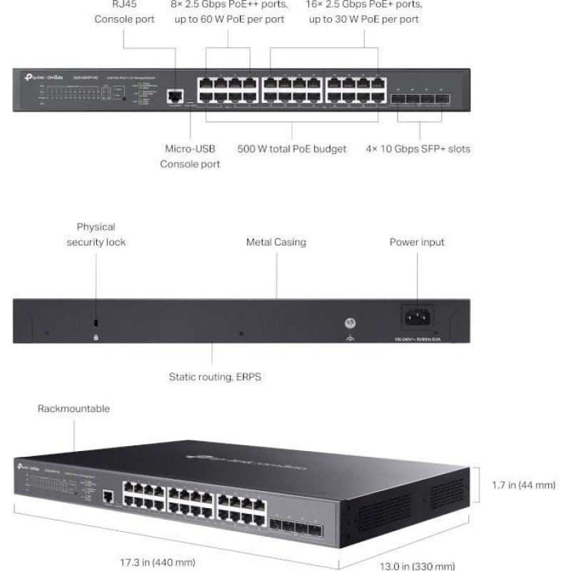 Інші порти:16x2.5GbE PoE+ RJ45 ports, 8x2.5GbE PoE++ RJ45 ports, консольний порт RJ45, консольний порт Micro-USB
