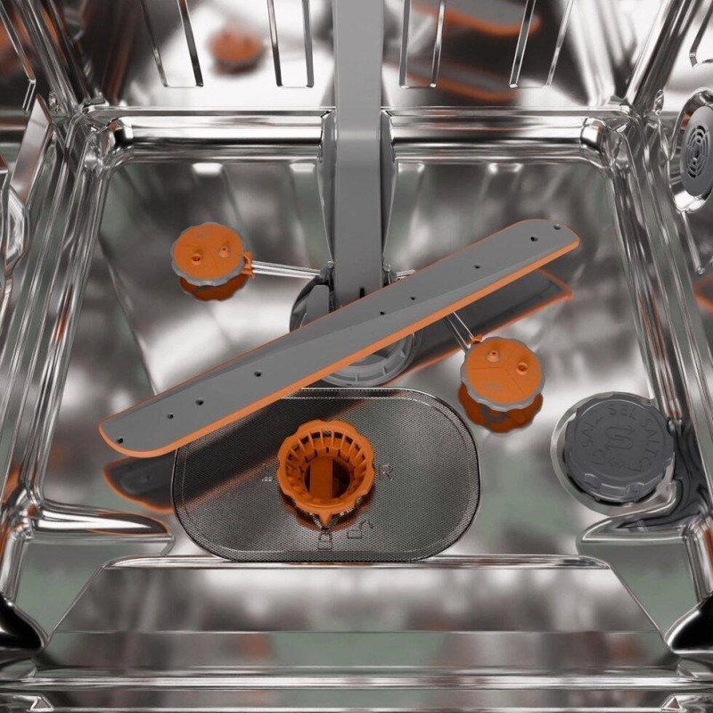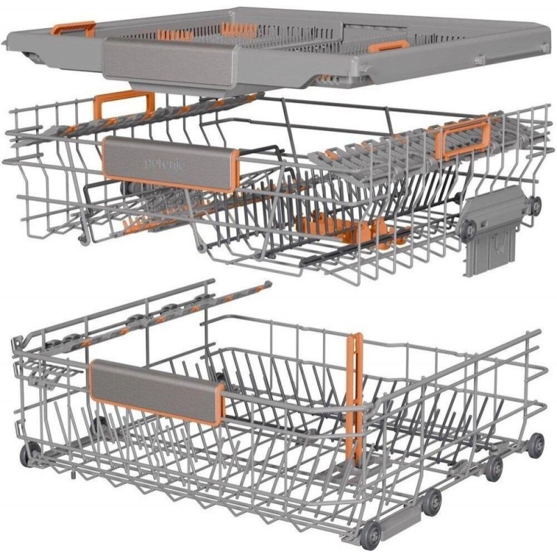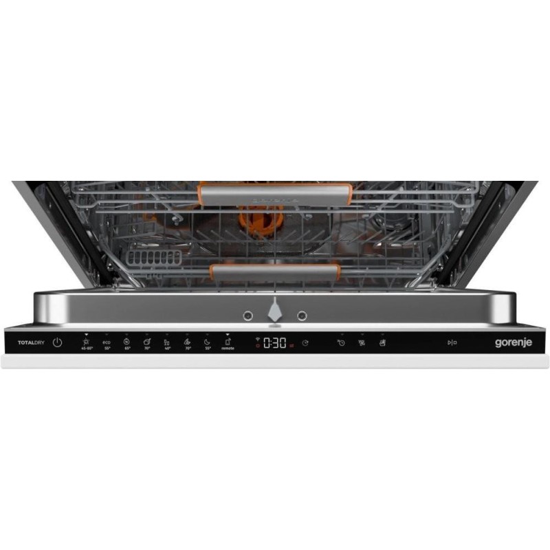 Gorenje GV673D63 – полностью встроенная посудомоечная машина шириной 59,8 см, рассчитанная на загрузку до 16 комплектов посуды. Высота корпуса составляет 81,6 см, глубина – 55,5 см, в то же время для установки нужна ниша шириной не менее 60 см и высотой от 82 см. Модель оснащена инверторным двигателем PowerDrive, работает с уровнем шума 44 дБ и тратит 9,5 л воды за цикл. По новой энергомаркировке Gorenje GV673D63 относится к классу D, потребление электроэнергии для экопрограммы составляет 0,85 кВт-ч за цикл и 85 кВт-ч на 100 циклов. В машине предусмотрено 7 программ и 5 температурных режимов 40°C, включая интенсивную, ECO, гигиеническую, автоматическую, ночную, программу для стекла и цикл "1 час". Дополнительно поддерживается SpeedWash с ускорением ряда программ, отложен старт до 24 часов и встроенное Wi-Fi-управление через приложение. За сушку отвечает система TotalDry с автоматическим открыванием дверцы после завершения цикла, а ход программы отображается лучом на полу. Внутри установлены три корзины, включая отдельный верхний лоток для столовых приборов, есть регулировка верхней корзины по системе Click-Clack, сложные элементы для чашек, тарелок, бокалов, а также держатель для бутылок и ваз над зоной JetSpray. Gorenje GV673D63 дополнительно оснащена фильтром для самоочистки, программой самоочистки, аквасенсором, подключением к горячей воде до 70 °C и полной защитой от протекания AquaStop.
