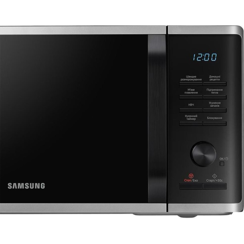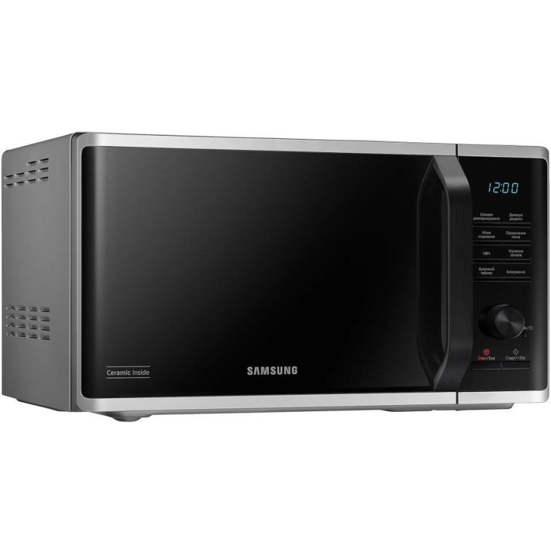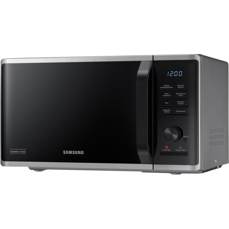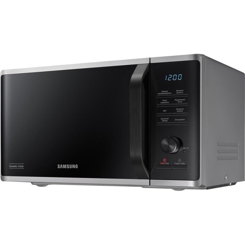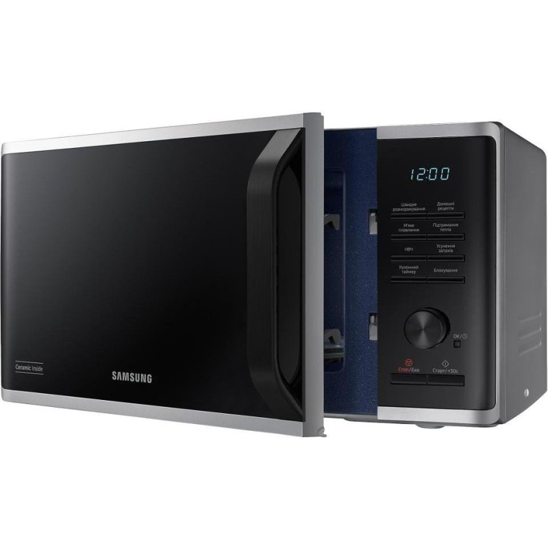 Модель Samsung MS23K3515AS\u002FUA - это настольная микроволновая печь с объемом внутренней камеры 23 л и мощностью потребления 1250 Вт. Корпус печи выполнен в серебристом цвете, передняя панель оснащена ручкой открывания, поворотным регулятором и кнопками управления, встроенный LED дисплей позволяет задавать время и отслеживать выбранный режим. Одной из особенностей модели Samsung MS23K3515AS\u002FUA является наличие меню на украинском языке, что делает его максимально понятным и удобным в использовании для широкой аудитории пользователей. Внутренняя поверхность выполнена с керамическим покрытием CERAMIC INSIDE, устойчивым к царапинам, легко очищаемым и долговечным. В модели MS23K3515AS\u002FUA предусмотрена функция «Быстрая разморозка» (Quick Defrost), которая позволяет равномерно размораживать замороженные продукты. Также есть набор автоматических программ Auto Cook - около 20 предварительно установленных рецептов, что позволяет приготовить популярные блюда без ручной настройки мощности или времени. Для безопасности предусмотрена блокировка от детей, а режим ECO снижает потребление энергии в режиме ожидания. Диаметр поворотного стола Samsung MS23K3515AS\u002FUA составляет 288 мм, что делает устройство удобным даже для больших тарелок. Благодаря компактным габаритам, эта модель легко разместится на кухонной поверхности.