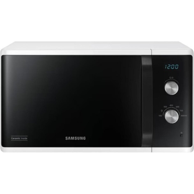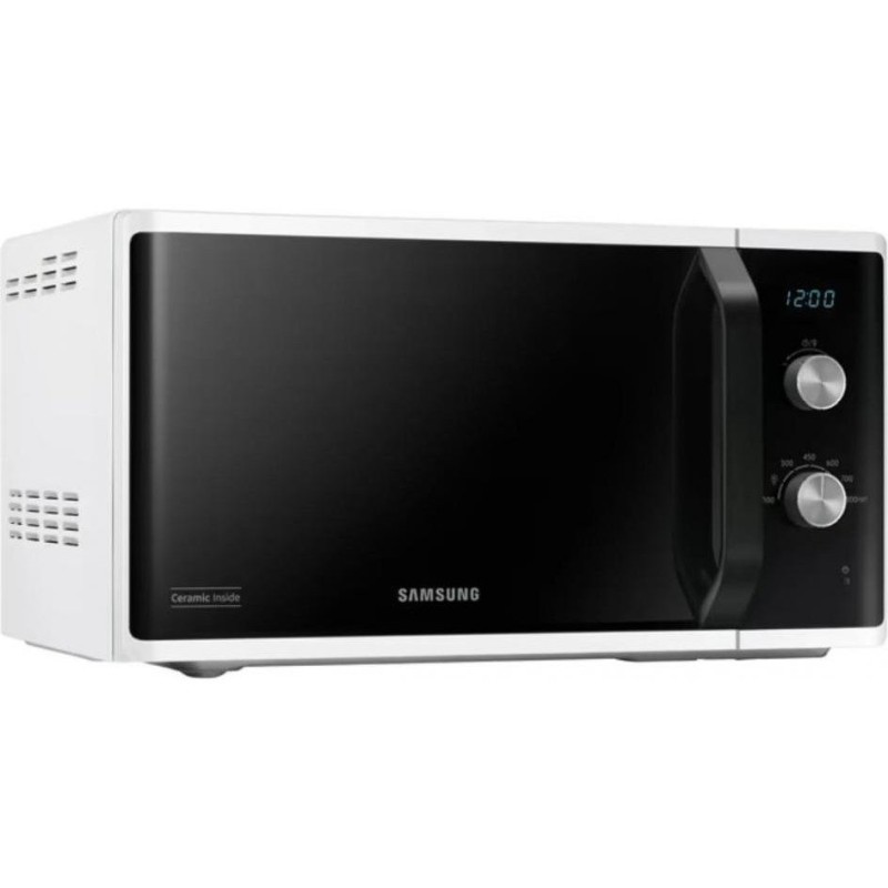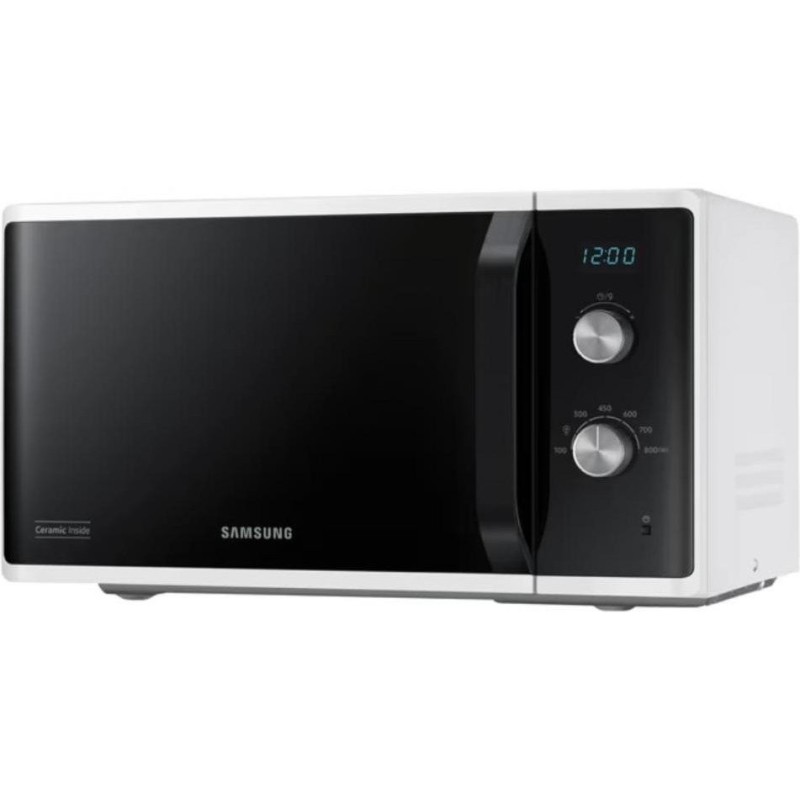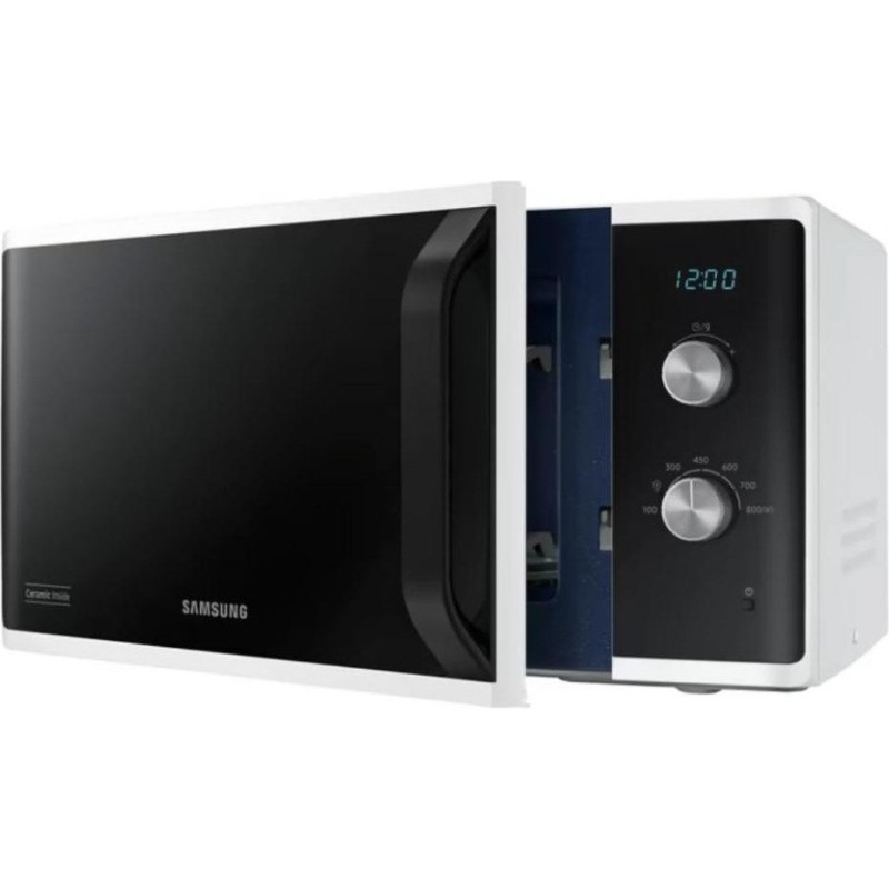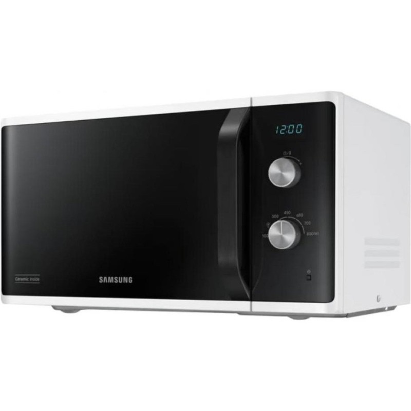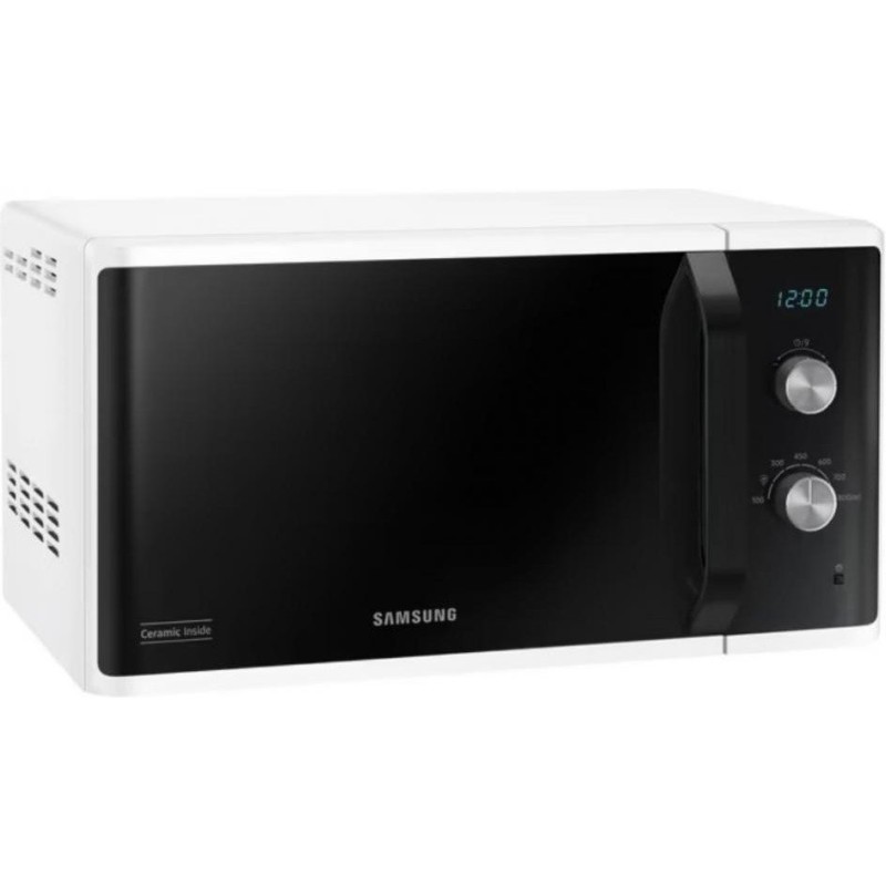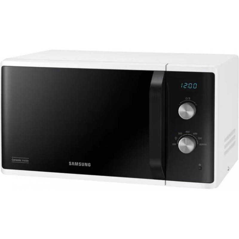 Микроволновка Samsung MS23K3614AW – отдельностоящий прибор в белом корпусе полезным объемом 23 литра. Мощность установленного СВЧ-источника составляет 800 Вт и регулируется 6 уровнями. Особенностью модели является система тройного распределения микроволн, равномерно прогревающая блюдо со всех сторон. Кроме этого, внутренняя поверхность камеры покрыта биокерамической эмалью, которая не только крепка и легко очищается, но и обладает антибактериальными свойствами. В устройстве имеется вращающийся стол диаметром 288 мм, а дверца открывается с помощью удобной стильной ручки. Прибор оснащен функцией автоматической разморозки, для которой необходимо установить вес продукта, или самостоятельно задать время работы. Управляется микроволновка Samsung MS23K3614AW двумя эргономичными поворотными переключателями, одним из которых выбирается время и вес, а другим – мощность нагрева.