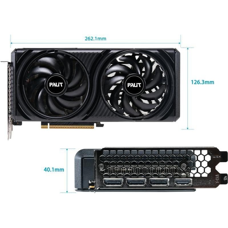 Palit GeForce RTX 5060 Infinity 2 OC (NE75060V19P1-GB2063L) – компактная 2-слотовая видеокарта на архитектуре NVIDIA Blackwell для сборок, где важны современные интерфейсы, умеренное энергопотребление и эффективное охлаждение без лишних элементов. В Palit GeForce RTX 5060 Infinity 2 OC (NE75060V19P1-GB2063L) установлено 3840 CUDA-ядер и 8 ГБ видеопамяти GDDR7 со скоростью 28 Гбит, 128-битной шиной и пропускной способностью хватает для актуальных игр в 1080p, работы с тяжелыми текстурами и ускорения задач в совместимых графических приложениях. Подключение к системе производится через PCI Express 5.0, а заводской разгон задает максимальную частоту Boost до 2512 МГц (по сравнению с типичными референсными значениями). Набор видеовыходов ориентирован на современные мониторы: 3×DisplayPort 2.1b и 1×HDMI 2.1b, поддерживается подключение до 4 дисплеев и вывод до 7680×4320. Энергопотребление заявлено до 145 Вт; питание – 1×8-pin, рекомендованный блок питания – от 550 Вт. Охлаждение построено на двух вентиляторах с режимом остановки при низкой нагрузке и композитных теплотрубках для более быстрого отвода тепла. Габариты Palit GeForce RTX 5060 Infinity 2 OC (NE75060V19P1-GB2063L) – около 262×126×40 мм, что облегчает установку в большинство корпусов без перехода на массивные 3-слотные решения.