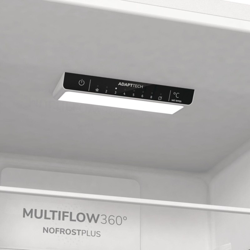 Технологія AdaptTech: розумна система підтримує постійну температуру в холодильнику незалежно від того, як часто ви відкриваєте дверцята. Вона безперервно стежить і аналізує, як і коли ви користуєтеся холодильником, а також управляє температурою, щоб зберегти свіжість продуктів і знизити споживання електроенергії. Відкривання дверцят: вліво / вправо. Звуковий і світловий сигнал про перевищення температури в х / о: біла лампочка. Контейнер для овочів CrispZone. Режим зниження енерговитрат «Еко». Світлодіодне освітлення на стелі. Збільшений ящик SpaceBox (38 л)