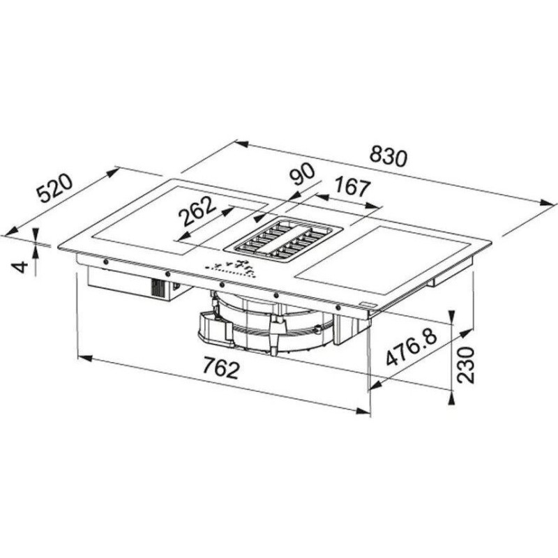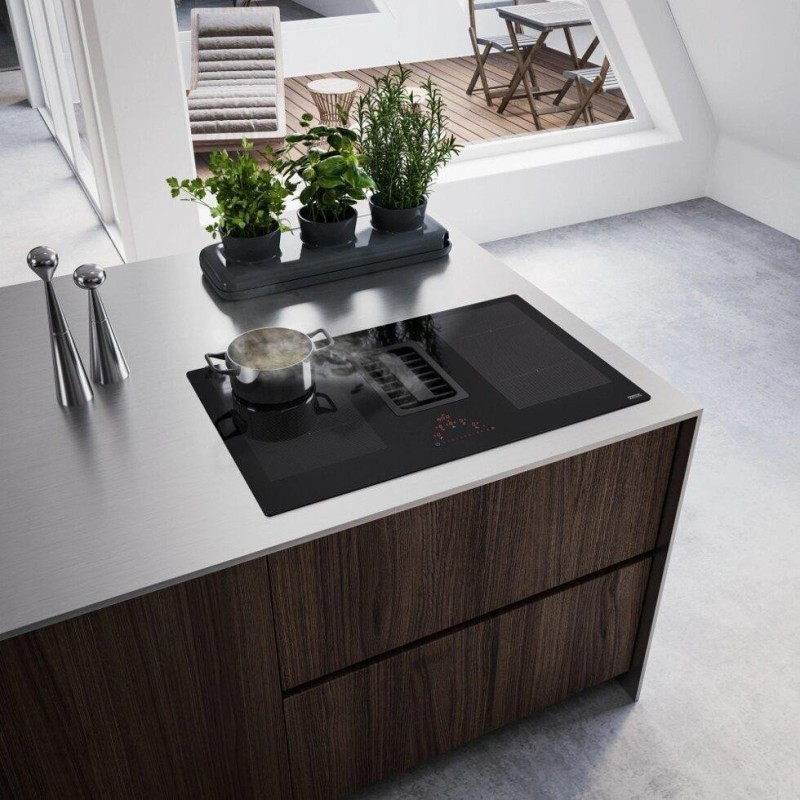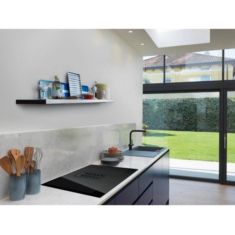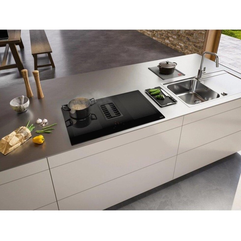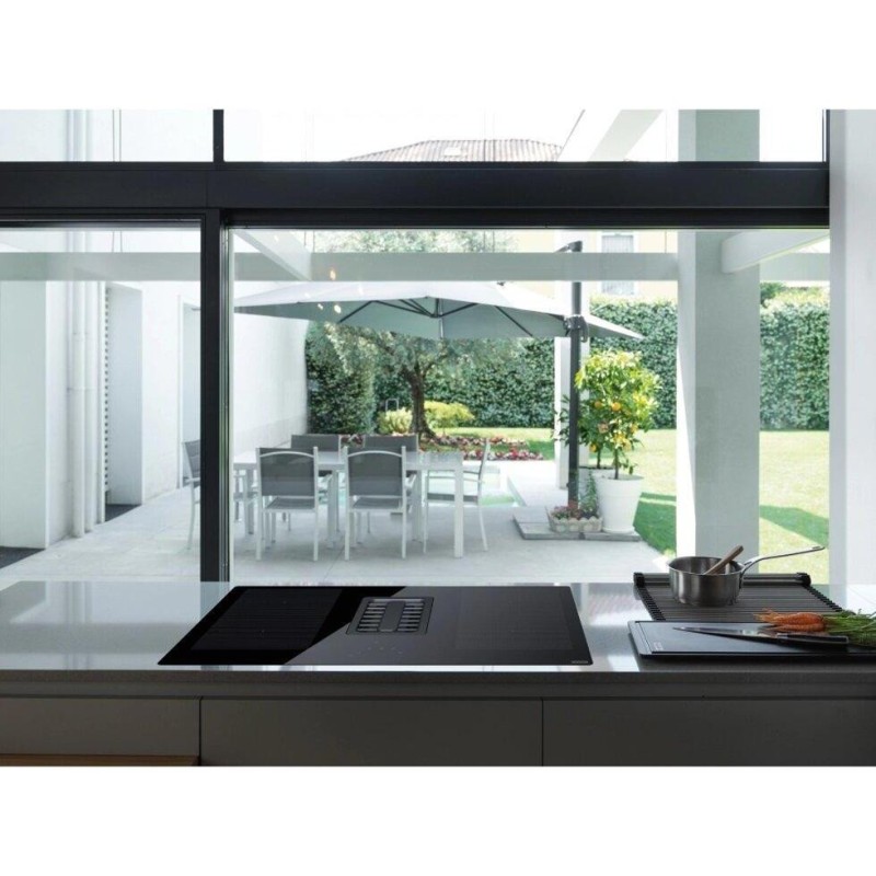 Центральна решітка втягування виконана з чавуну. Два рівня підсвічування дисплеїв дозволяють визначити активна функція чи ні. Таймер для кожної зони. Витяжка автоматично регулює продуктивність залежно від потужності зон нагріву. Алюмінієвий антіжіровим фільтр. Функція обмеження максимальної потужності Power Limitation (2,8 кВт -3,5 кВт - 4,5 кВт - 7,5 кВт). Витяжка вбудована в варильну поверхню: кількість швидкостей - 8 + інт, продуктивність при інтенсивному режимі - 700 м3 / год., Максимальний рівень шуму (дБ) - 72. Контроль стану фільтрів